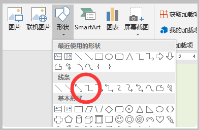 3、在打开的“形状”选项菜单中选择“肘形连接符”的图标。