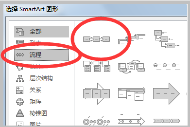 2、进入到Smartart选项界面之后,在里面选择流程,并点击其中一种流程图样式。