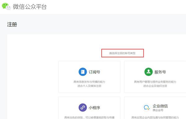 2、在注册页面选择需要注册的公众号类型,一般分为订阅号和服务号;