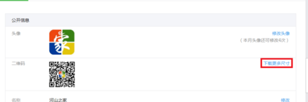 3、进入“公众号设置”以后,再看见的那个二维码最右边,会有一个“下载更多尺寸”的链接。