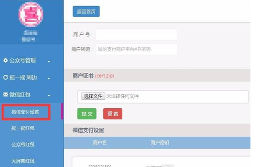 3.选择功能管理→微信红包→微信支付设置。提交支付资料。