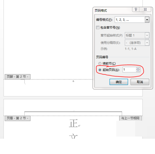 5、最后鼠标移到第二页页码处,点击插入——页码——设置页码格式,将起始页设置为1,关闭页眉和页脚即设置成功。