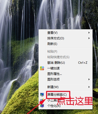 在屏幕的空白处点击鼠标右键,在下拉菜单中点击“屏幕分辨率”。