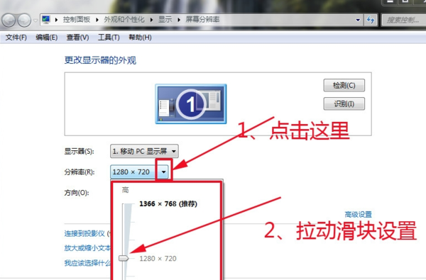 这时,会弹出“屏幕分辨率”对话框。如果想简单设置的话,可以点击对话框中“分辨率”后面的黑色小三角,在下拉菜单中拉动小滑块来设置分辨率。
