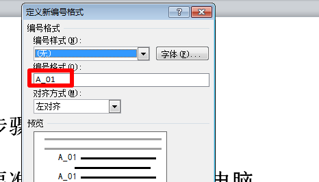定义序号的格式:点击开始菜单下的“编号”图标右侧向下的箭头,再选择定义新编号的格式,在弹出对话框中的“编号格式”选项选择需要的格式,注意把编号后的“.”删除,然后点击确定按钮,完成序号格式定义。