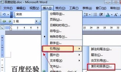 2、然后选择插入菜单——选择引用——选择索引和目录