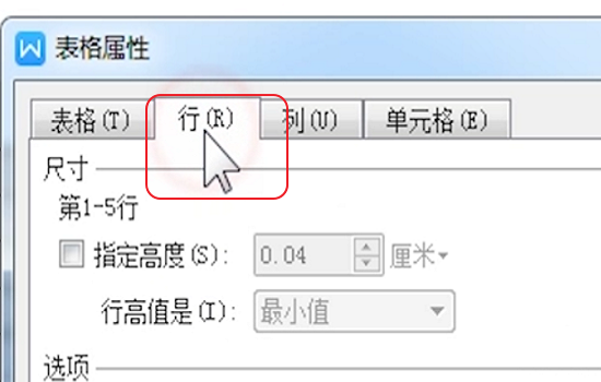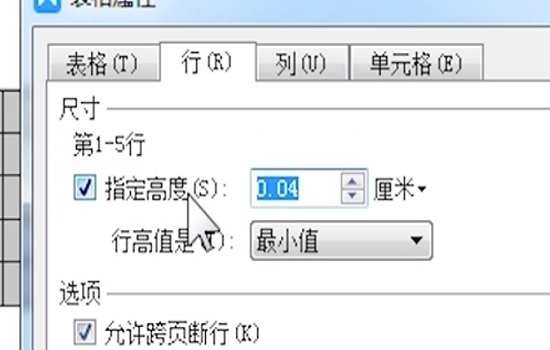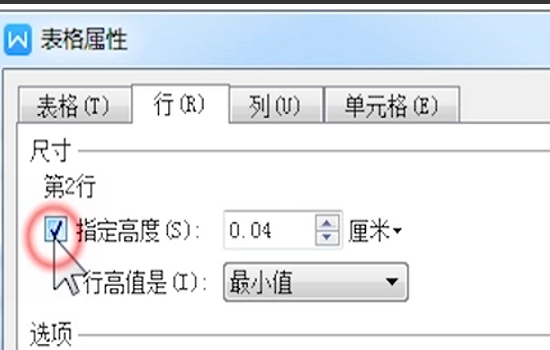 6、当鼠标在某一行内鼠标右击点击“表格属性”——“行”选项卡中还可只对该行精确设置。
