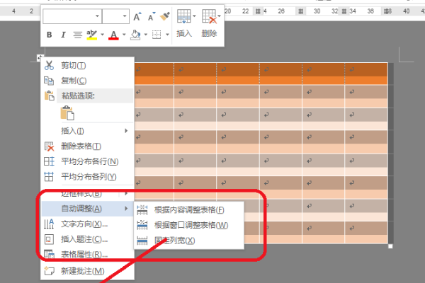 2、右键点击框体,弹出下拉菜单选择自动调整功能,表格可以根据表格内的文字多少进行自动调整表格大小;