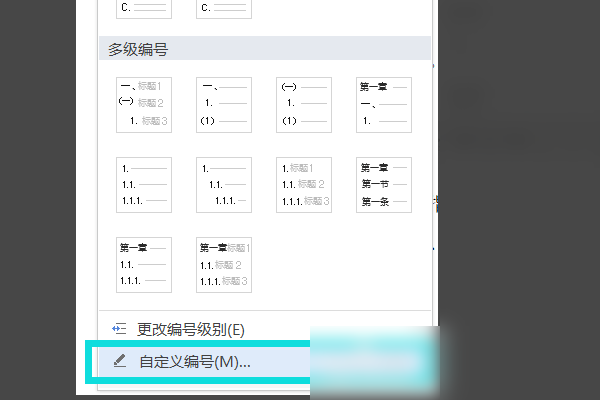 1、将光标移至需修改的标题处,点击上方工具栏中“编号”点击“自定义编号”。