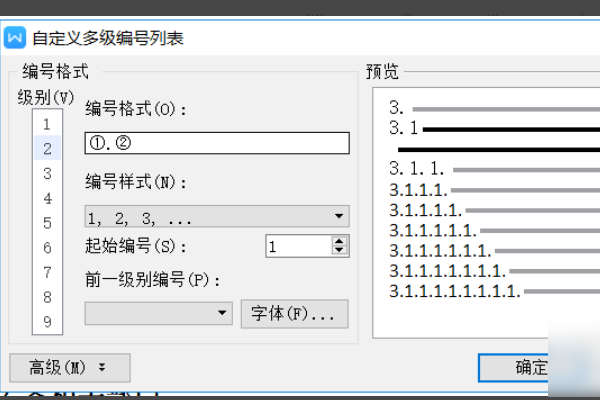 3、出现“自定义多级编号列表”的功能窗口,包含许多的设置功能。