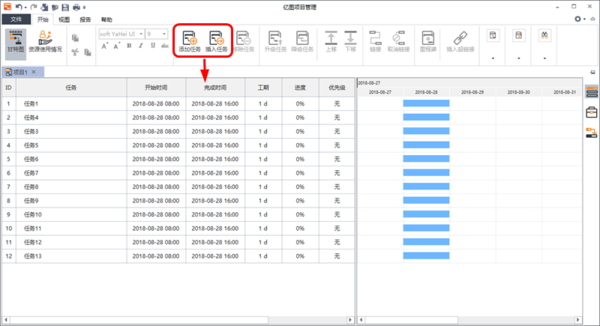 用鼠标点击【开始】菜单栏下的【添加任务】或【插入任务】,新建任务列表。使用快捷键Enter可以添加一个与最后一个任务同级的新任务在最后,使用快键键Ins可以插入一个与选中任务同级的任务在上方。