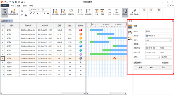 在甘特图中选中一个任务,然后可在右侧的任务面板中对该任务的名称、优先级、进度、里程碑、开始结束时间等进行自由设置,当然你也可以选择用鼠标直接在该任务中进行修改。