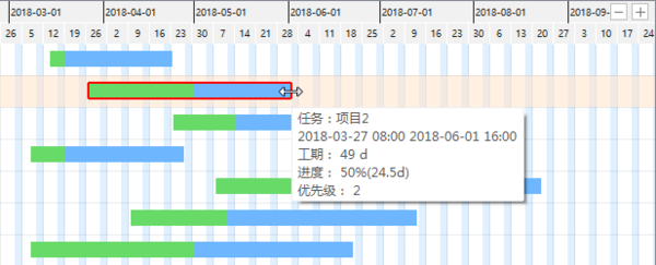 我们可以用鼠标直接拖动边框以更改项目的工期,绿色区域代表任务的完成进度,蓝色区域为未完成进度。