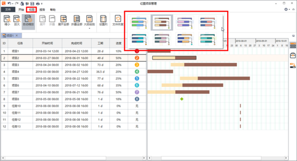 如果觉得颜色不好看,还可以通过【视图】选项来更换主题色彩,让甘特图看起来更美观。
