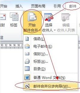 点菜单“邮件,在面板中选择“开始邮件合并”按钮,在下拉菜单中,选择“邮箱合并分步向导…”