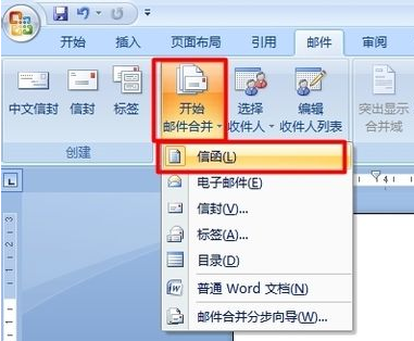 3、切换至“邮件”功能区,点击“开始邮件合并”下拉列表,从中选择“信函”项;