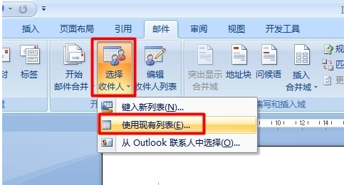 4、点击“选择收件人”下拉列表,从中选择“使用现有列表”项;