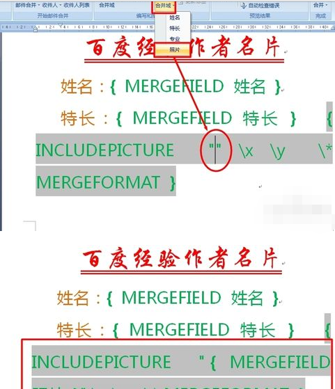 9、按键盘上的“Alt+F9”进入域代码模式,然后在“IncludePicture”后面输入双引号,然后点击“插入合并域”->“照片”项。最后再次按“Alt+F9”返回正常模式;