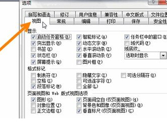 3、 在打开的选项对话框中选视图选项卡, 勾选:显示选项下的:启动任务窗格 ;