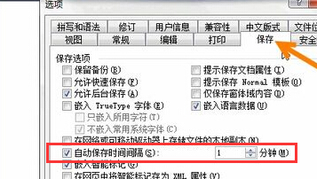4、再点选保存的选项卡,勾选:自动保存时间间隔,并设置为1分钟,原因:每分钟会自动保存一次,有利于恢复文档,是恢复文档的前提条件,点击确定即可;