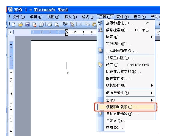 ②单击Word菜单栏的“工具”,然后选择“模板和加载项”;