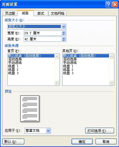 2、弹出页面设置对话框,选择纸张选项卡,在纸张大小处选择自定义大小,宽度设为:29.7;高度设为:42,如图所示。