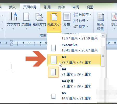 1、word2010有时选择页面纸张大小时会发现没有A3的选项。