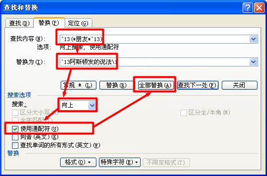 2、用替换命令:查找内容输入:^13(*朋友*^13)