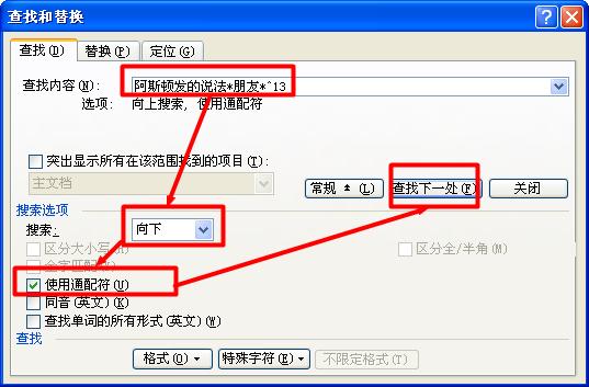 在查找的“高级”选项中选择“使用通配符”
