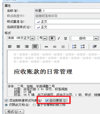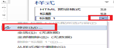 2.修改标题样式的格式。点击标题1右侧的图标,选择“修改”,弹出修改样式对话框。可修改的内容包括字体、段落、制表位和编号等。勾选自动更新,点击确定。按报告格式的要求分别修改标题1、标题2、标题3的格式(建议报告目录最多显示三级即可)。