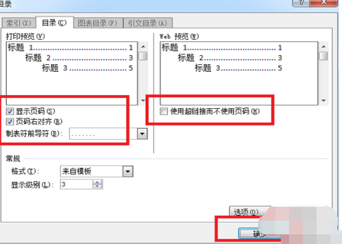 4.提取目录。按格式要求,目录应位于正文前面。在正文前插入一新页(在第一章的标题前插入一个分节符(下一页)),将光标移到新页的开始,键入“目录”二字,并设置好格式。新起一段落,选则“【引用】-【 目录】-【 插入目录】”,弹出“目录”对话框,如图所示进行相应设置,单击“确定”后目录生成完毕。