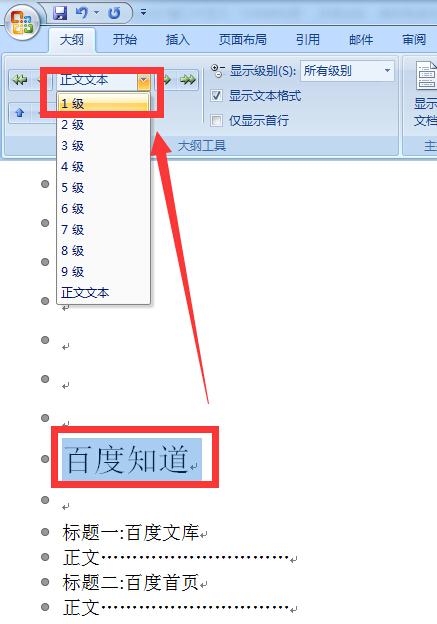 选中内容》下拉菜单》选择级别