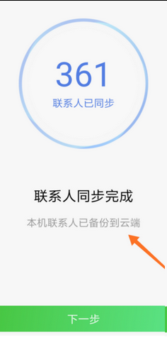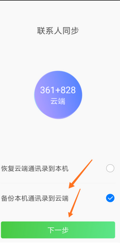 3丶勾选备份本机通讯录到云端,之后点击下方的下一步按钮。