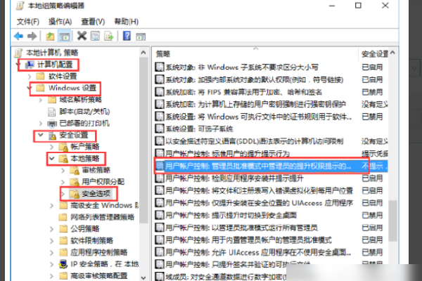 2、在打开的窗口中,展开“计算机配置 - Windows设置 - 安全设置 - 本地策略 - 安全选项”,然后在右侧找到“用户帐户控制:管理员批准模式下的管理员升级”提示行为的权限“。