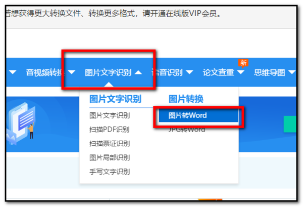 2、接着在网页上方菜单栏“图片文字识别”菜单里点击”图片转word“选项。