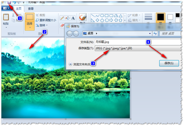 5、点击【画图】工具【文件】菜单下的“另存为”。给文件设置保存路径、重新命名,并且将“保存类型”设置为JPEG,最后点击“保存”即可。