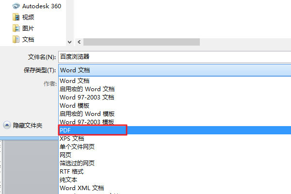 第二步,弹出对话框中找到保存类型,在下拉菜单中点击PDF,点击保存。