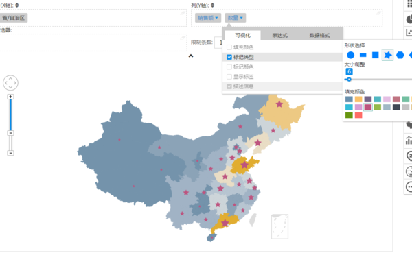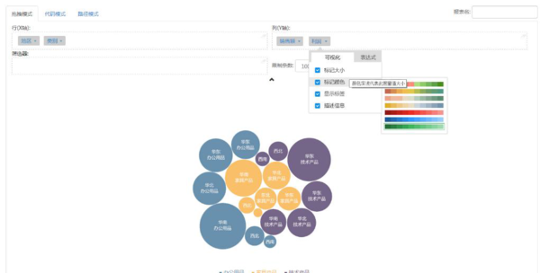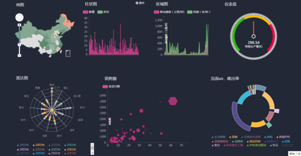 推荐 大数据魔镜,可视化效果很多,柱形图,线图、地图、雷达图、气泡图,区域面积图形等都有的,可以加标签,备注,导出数据等,还有分析,筛选等很多功能。关键还是免费使用。图形效果也很绚丽,可调色。