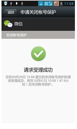 6、提示受理成功,等到48小时后就可以关闭登陆保护,也就是可以登微信了。