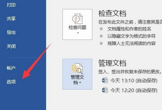 1、打开word2010,点击“文件”菜单下的“选项”栏,如图所示:
