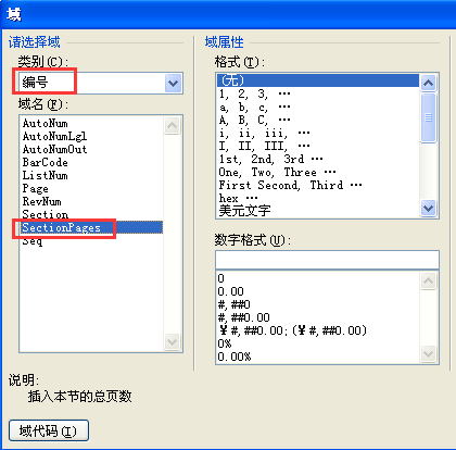 3、弹出域对话框,在类别处选择编号,在域名处选择SectionPages即可,如图所示。