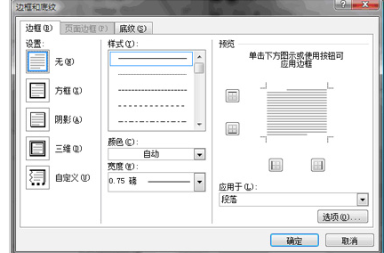 在“边框”选项卡的“应用于”下拉菜单中选中“段落”选项。然后单击“设置”区域的“无”选项,并单击“确定”按钮即可去掉Word页眉横线.