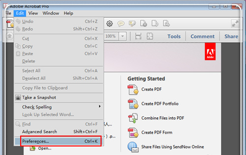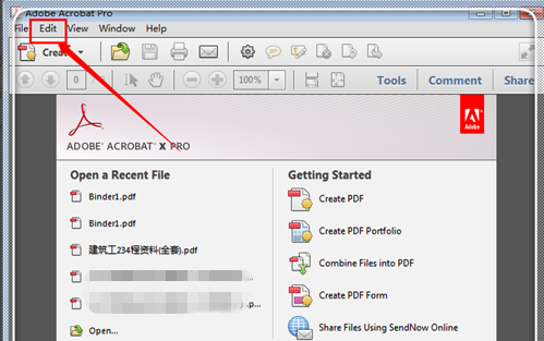 2.进入Adobe reader之后,点击上方的“编辑”(edit),进入比那几选项。这里是英文版,若你的是简体中文的,这里给你进行了汉语的命令,按照操作即可。