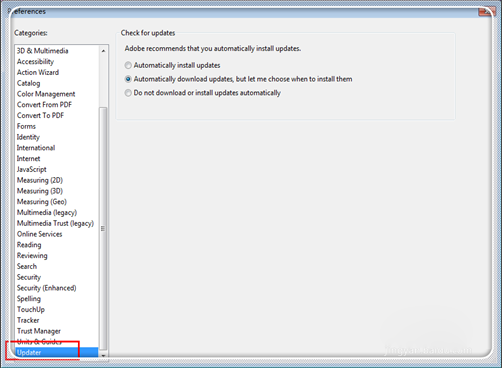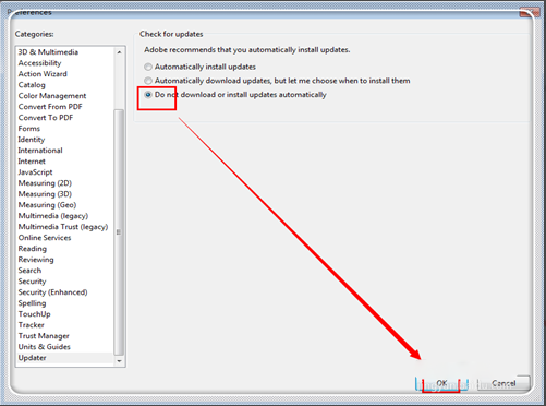 5.进入更新设置中,点最下面一个选项“禁止自动下载安装更新”(don't download or install updates automatically”。点击最下方的“确定”(OK)。