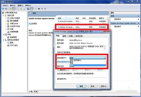 打开计算机服务界面,找到并双击Adobe Acrobat Update Servise项目,在属性界面,将启动类型设置为“禁用”后,关闭窗口即可。这是最彻底的方法。