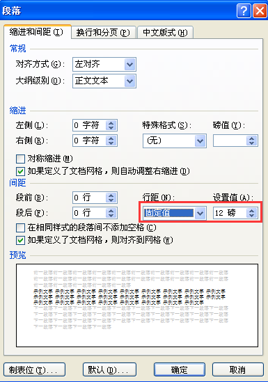 3、弹出段落对话框,在行距处选择固定值,默认为12磅,将其数值调小即可,如图所示。