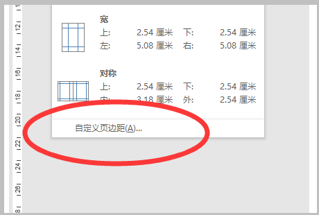 2、打开“页边距”的下拉菜单选择其中的“自定义页边距”。