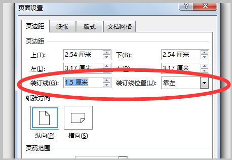3、然后开启页边距设置窗口,设置好装订线的数据,选择装订线的位置为“靠左”。