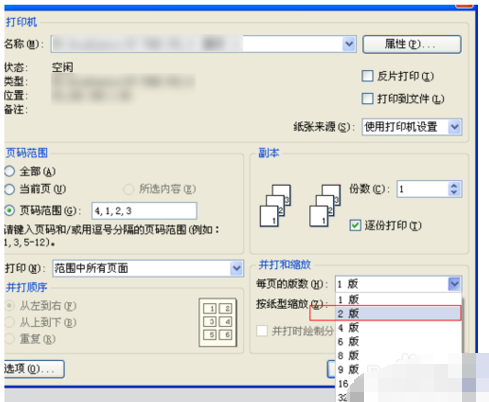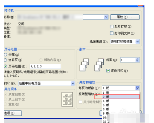 4.又回到打印界面进行关键设置,就是数字参数的设置,在页面范围里设置 4,1,2,3 (以4页为例)这点是正确输出小册子的关键因素之一。
