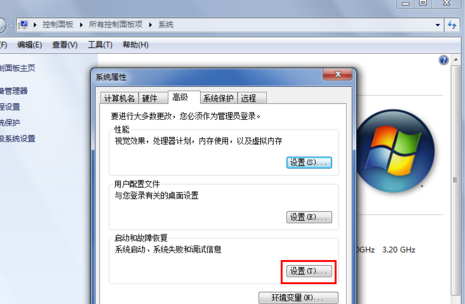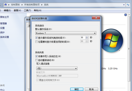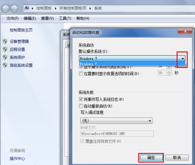 4.在“系统属性”对话框中点击启动和故障恢复下面的“设置”按钮,就打开如下的设置对话框。